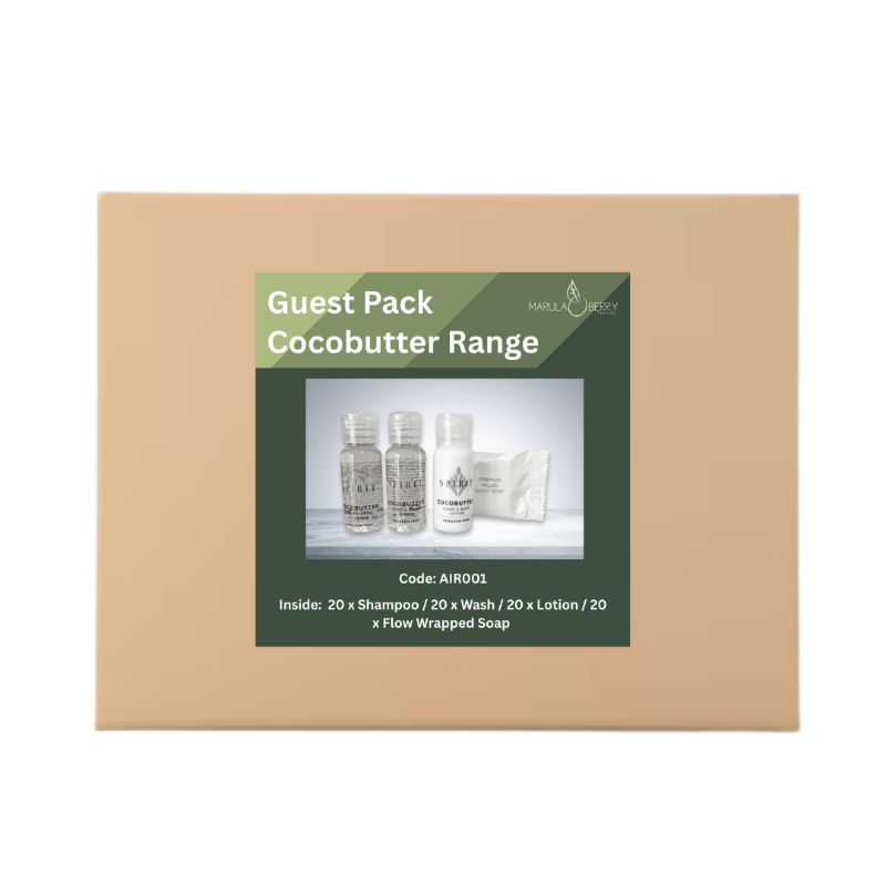 Enhance your guests' stay with the Cocobutter Guest Pack. This collection features the warm, creamy scent of cocoa butter and provides a complete set of quality, nourishing amenities for a truly luxurious and pampering experience.